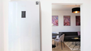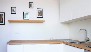 Svetlá kuchyňa je vybavená kvalitnými vstavanými spotrebičmi. Z kuchyne sa dostanete priamo na krásny balkón, kde môžete mať pri západe slnka romantickú večeru každý večer.